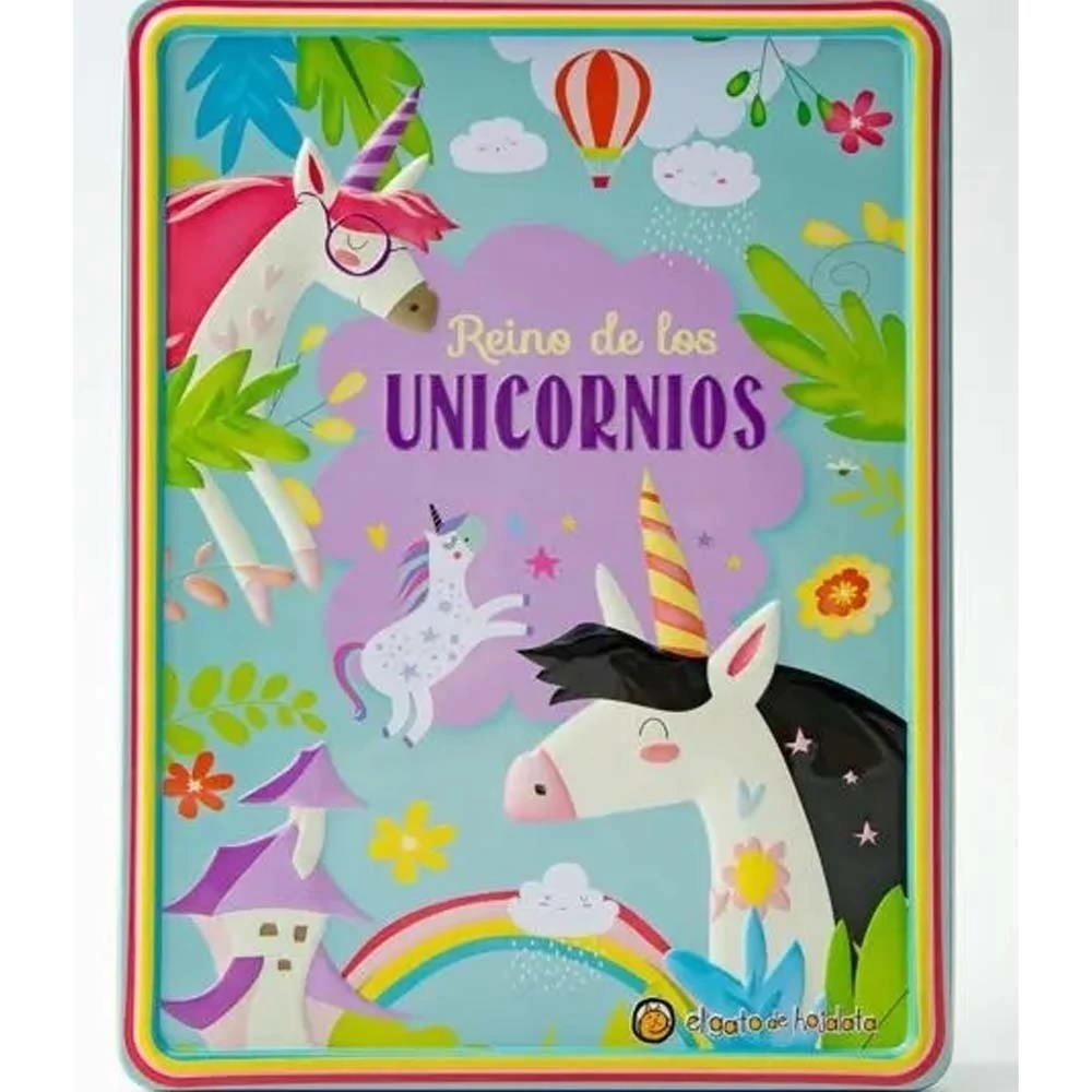 Una tierna lata de unicornios con un libro para pintar, rompecabezas y stickers para pegar donde quieras. Un pack completo con libro de cuentos, 4 marcadores, 1 rompecabezas doble para armar, a color por un lado y para colorear por el otro, y, stickers.